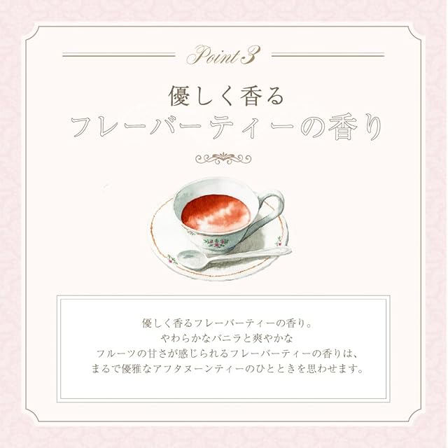 【香り】フルーツの甘さが感じられるフレーバーティーの香りは、まるで優雅なアフタヌーンティーのひとときを思わせます。