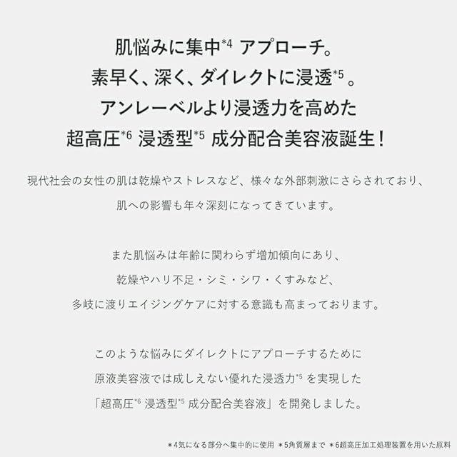 100MPaの超高圧※1技術で生まれた 浸透型※2オールインワンジェル 100MPaビタミンC誘導体*配合。 水深1万メートルの圧力に相当する超高圧で処理したビタミンC誘導体*が角質層のすみずみへ浸透。うるおいを与え、毛穴※3が目立ちにくいなめらかな肌へと整えます。 ※1超高圧加工処理装置を用いた原料 ※2角質層まで ※3乾燥によって開いた毛穴 *超高圧処理したテトラヘキシルデカン酸アスコルビル(保湿)を配合