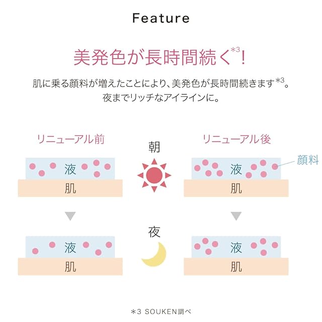 ラブ・ライナー リキッドアイライナーR5の付け替えようリフィル。 研究を重ね、液の吐出量を上げつつ、液漏れしないギリギリの量に調整。筆記時の発色が良くなり、美しい描線に。 肌に乗る顔料が増えたことにより、美発色が長時間続きます*1。夜までリッチなアイラインに。 描き心地はそのままに、かすれにくさがアップ*2。耐久性も良くなり1日中にじみ知らず*3。 *1 SOUKEN調べ。 *2 リニューアル前との比較 *3 当社調べ。効果には個人差があります。
