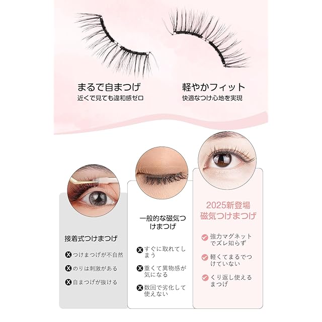 【肌にやさしいマグネット式】最新のマグネット技術を採用したつけまつげで、接着剤を一切使用せず、肌への刺激やベタつきのご心配は不要です。まぶたに優しく、装着や取り外しも簡単で、初心者の方でもスムーズに使用可能。自然なフィット感と快適なつけ心地で、目元に負担をかけず、ストレスのない美しさを叶えます。
