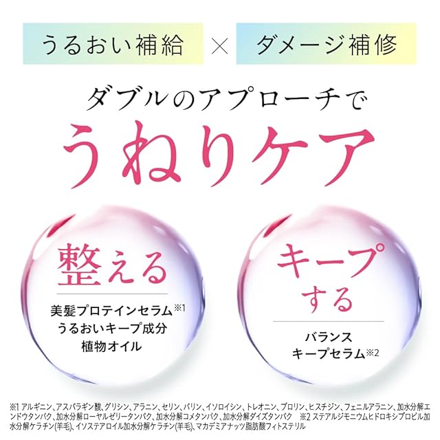 髪の黄金比率に着目したバランスケヘアトリートメントです。髪内部を最適なバランス【たんぱく質80%・水分15%・油分5%】に整えながらキープすることで、うねりのない素直なサラサラ髪へ導きます。シャンプーはPPT系×アミノ酸系洗浄成分を採用し、ダメージを受けた髪を補修しながら頭皮と髪をやさしく洗い上げます。毛髪補修成分とキューティクルケア成分配合で髪の内部・外部からダメージを補修。熱ダメージから髪を保護&補修するヒートケア成分配合。地肌を健やかに保つ頭皮ケア成分配合。香水のような高級感あふれる上品で華やかなペアー&ムスクの香り。