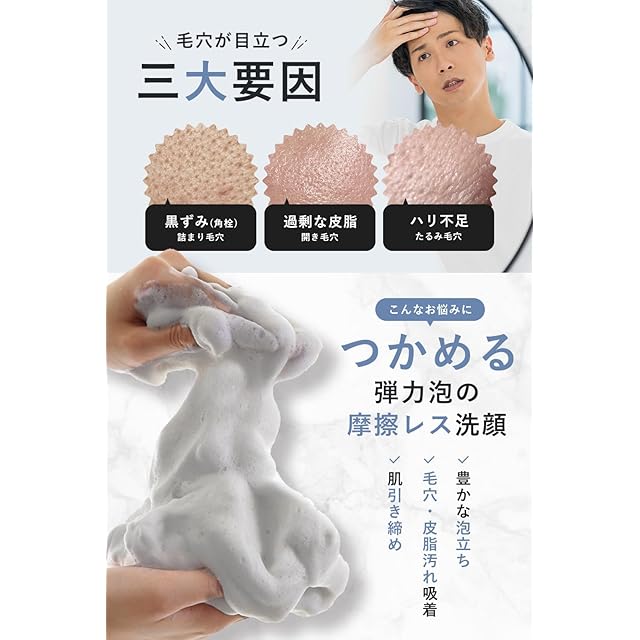 【男の 毛穴 皮脂 悩み解決 】ざらつきや毛穴の目立ち、テカリの原因となる不要な 角質 や 皮脂 をやさしくオフし、清潔感あふれるフレッシュな肌を叶える 洗顔 です。【泥 × 炭 】 ベントナイトという話題の” クレイ ”と、汚れの吸着力に優れた” 炭 ”を配合!毛穴の奥に詰まった皮脂や角質汚れを吸い上げて落とします。【ボリューミーな濃密泡 】 付属の洗顔ネットで誰でも簡単にもっちりとした泡が作れちゃいます。摩擦レスで肌にやさしい洗い上がりは、さっぱり感のあるさらっとした仕上がりでつっぱらないのが驚きです!【柑橘の香り 】ほのかに広がる「グレープフルーツの香り」。寝起きの朝や1日の疲れを感じた夜でも爽やかな気持ちになれ、使い心地抜群です。【使用方法① 】 濡らした洗顔ネットに 泥洗顔 を適量(1.5㎝ほど)出し、空気を含ませるように泡立てます。ネットから 泡 を手に取り、顔を泡で包んでゴシゴシ擦らず円を描くように洗います。洗った後は、ぬるま湯で泡がなくなるまで優しくすすぎます。肌トラブルの原因になるすすぎ残しに注意して、よく洗い流してください。【使用方法② 】週に1~2回は泥パックとして使うのがお勧め!適量(3㎝ほど)を顔の気になる箇所に伸ばし、約1分放置します。その後泥がなくなるまでやさしく流します。