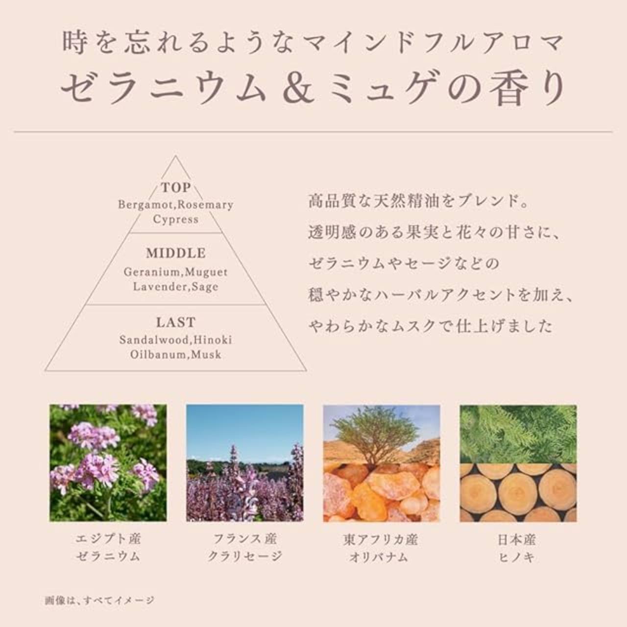 【ゼラニウム&ミュゲの香り】:時を忘れるようなマインドフルアロマ 高品質な天然精油をブレンド。透明感のある果実と花々の甘さに、ゼラニウムやセージなどの穏やかなハーバルアクセントを加え、やわらかなムスクで仕上げました。