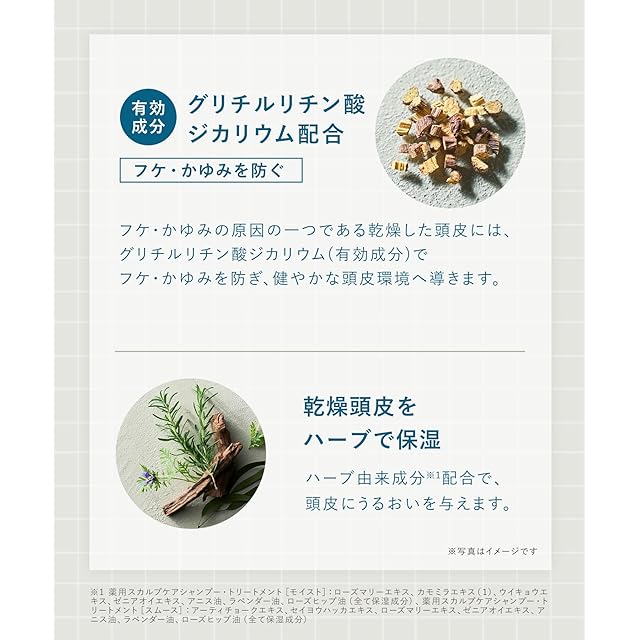 『乾燥によるフケ・かゆみを防ぎ※1、健やかな頭皮環境に整え滑らかな毛髪へと導く薬用シャンプー&トリートメント』 ※1 グリチルリチン酸ジカリウム(有効成分) 効能・効果:〈シャンプー〉フケ・かゆみを防ぐ。毛髪・頭皮の汗臭を防ぐ。毛髪・頭皮を清浄にする。毛髪・頭皮をすこやかに保つ。 香り :ラベンダー&ウッディーの香り 爽やかで上品な香り ーーーーーーーーーーーーーーーーーーーーーーーーーーーー ▼滑らかな泡が頭皮を優しく包み込み、有効成分※1がフケ・かゆみを防ぎ、ハーブ由来成分※2配合により、うるおいある頭皮へ導きます。 ※1 グリチルリチン酸ジカリウム(有効成分)、※2 ローズマリーエキス、カモミラエキス(1)、ウイキョウエキス、ゼニアオイエキス、アニス油、ラベンダー油、ローズヒップ油(全て保湿成分) ▼美容成分で注目されているCICA(シカ)※3やセラミド※4を配合。紫外線による乾燥ダメージを受けやすい頭皮を健やかな状態に保ちます ※3 ツボクサエキス(保湿成分)、※4 N-ステアロイルジヒドロスフィンゴシン、N-ステアロイルフィトスフィンゴシン、 ヒドロキシステアリルフィトスフィンゴシン(全て保湿成分) ▼アミノ酸MIX※5配合により、乾燥やカラーを繰り返した毛髪ダメージを補修し、吸着型ヒアルロン酸※6×ゴールデンシルク※7で保湿することにより、指通りの良い状態へ整えます。 ※5 L-グルタミン酸、L-アルギニン(全て保湿成分、※6 ヒアルロン酸ヒドロキシプロピルトリモニウム(保湿成分)、※7 加水分解シルク液(毛髪補修成分) ▼有効成分※1配合により、頭皮の気になるニオイを防ぎます ※1 グリチルリチン酸ジカリウム(有効成分)