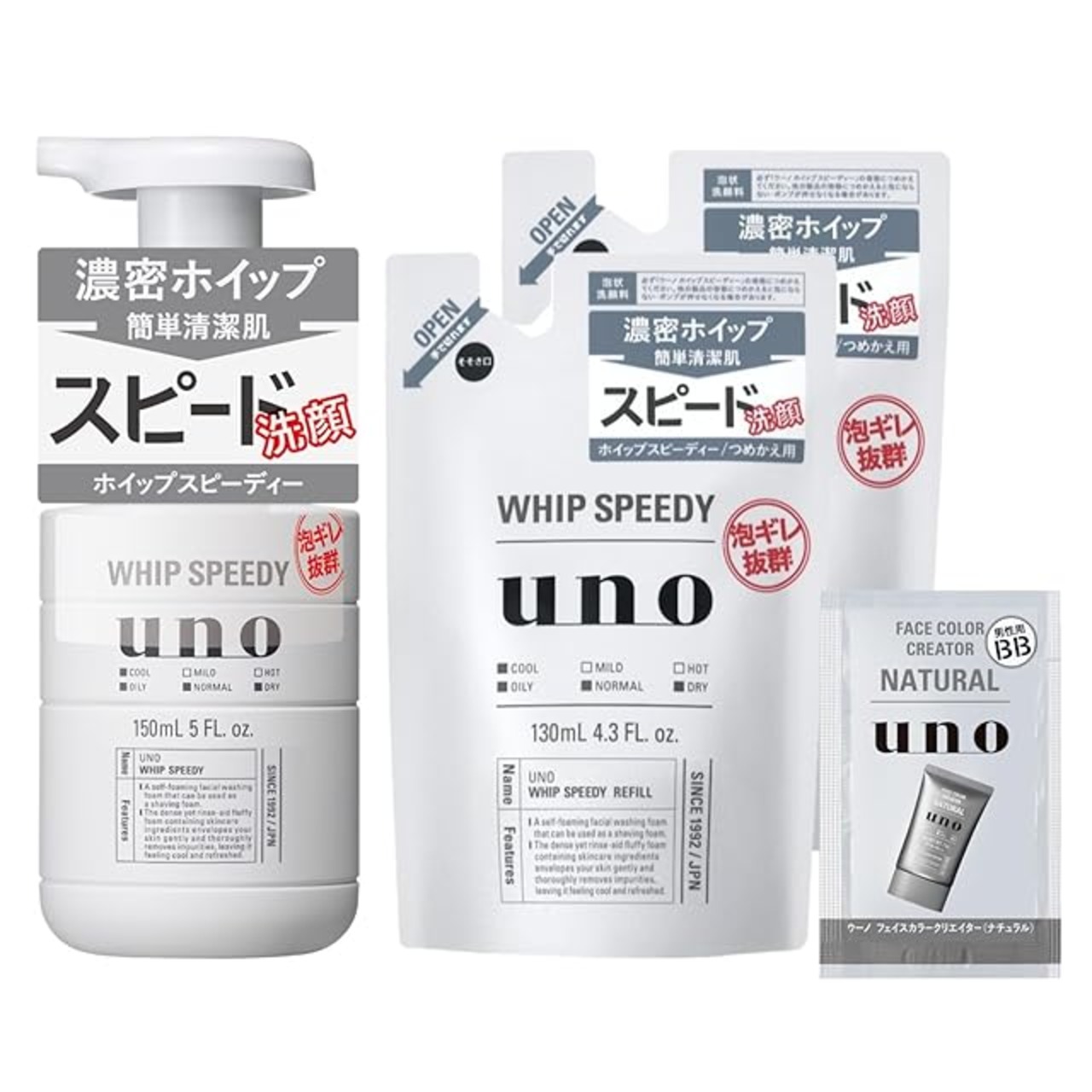 【.co.jp限定】 【まとめ買い】uno(ウーノ) ホイップスピーディー 泡状洗顔料 本体150mL+ つめかえ用130mL×2個 +おまけ 4個アソート