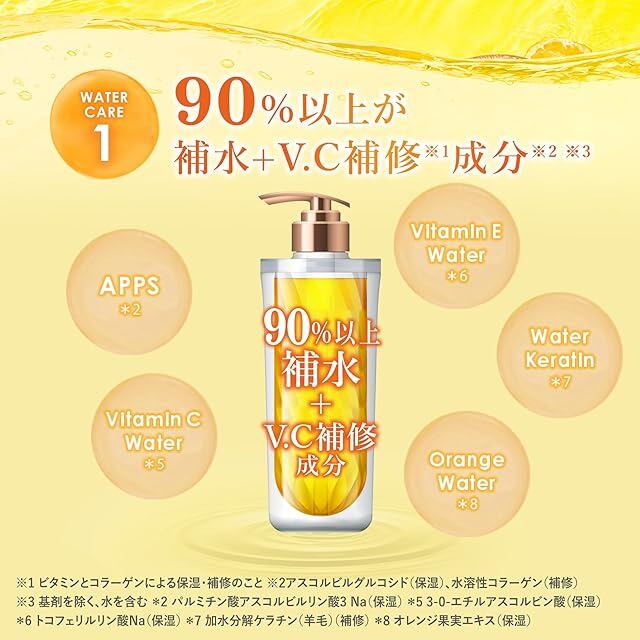 90%以上が補水+V.C補修成分。傷んだ髪細胞に栄養補給で髪の空洞化を満たすビタミン成分を凝縮しました。栄養不足の髪細胞を満たしてうるおいのあるサラツヤ髪へ。