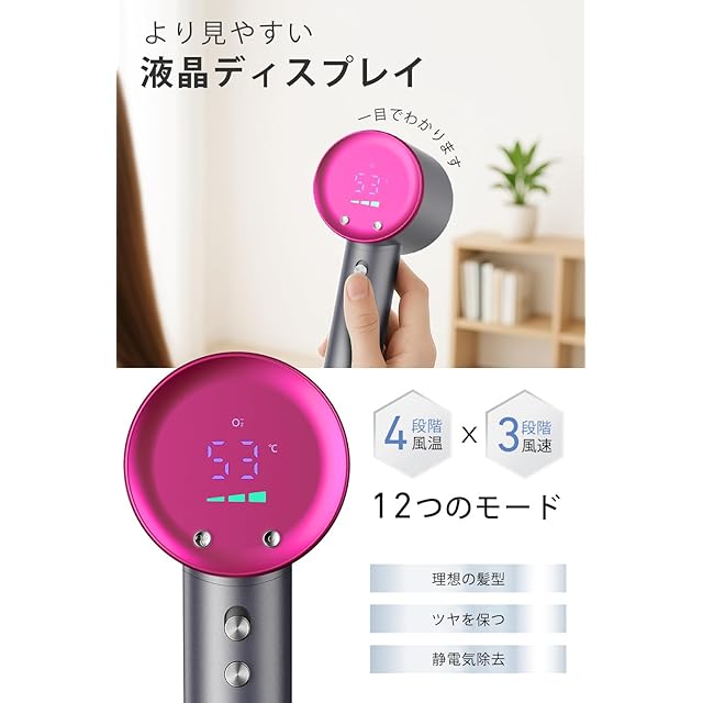 ▶【スマートディスプレイ搭載|12モード自由調整】 進化型ヘアドライヤーは温度・風量・イオンをリアルタイム表示。4段階温度×3段階風速=12種類のモードで、自分好みのスタイルを自在にアレンジ可能。冷風モードでは室温風をそのまま提供し、仕上げのスタイリングにも最適。さらにメモリー機能で前回設定を記憶するため、毎回操作不要。サロン帰りのような質感を手軽に再現できます。