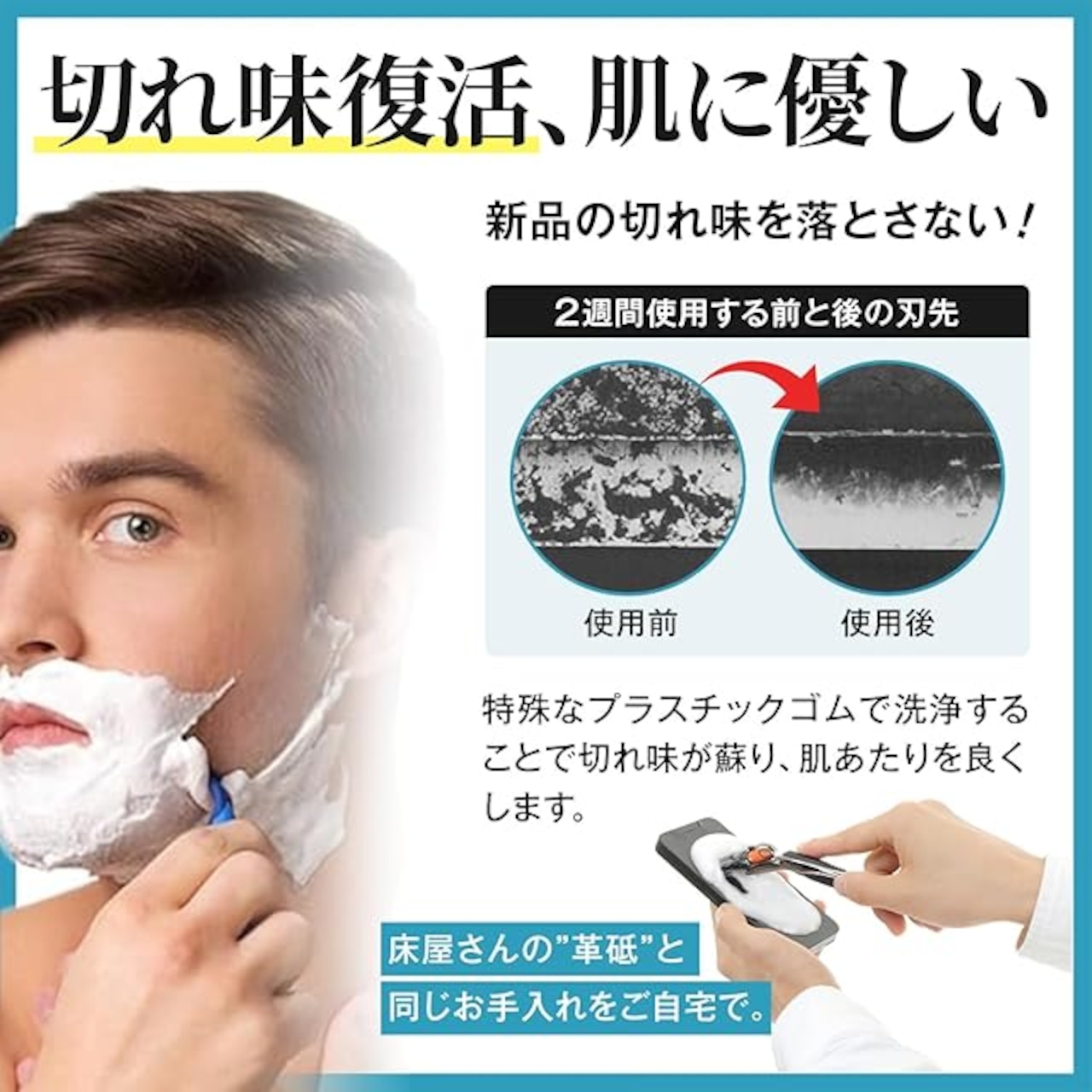 ※本製品は砥石ではありません。素材はゴムに近い素材です。また、刃の寿命を延ばすもので、既に切れ味の悪くなったカミソリを鋭利にするものではありません。※製造の際に波目の模様ができる場合がありますが、ゴムの面は平面であり不良でありません。