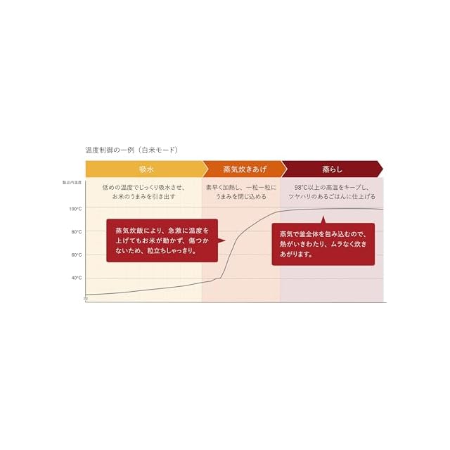 【お米のうまみを引きだす進化した温度制御】炊飯を開始すると、お米を低温でじっくり吸水。その後、一気に高温で炊きあげ、一粒一粒にうまみ成分であるデンプンを閉じ込めます。仕上げの蒸らしで、ツヤハリのあるごはんのできあがり。さらに緻密になった温度制御が、お米の甘み・香りを最大限に引き出します。