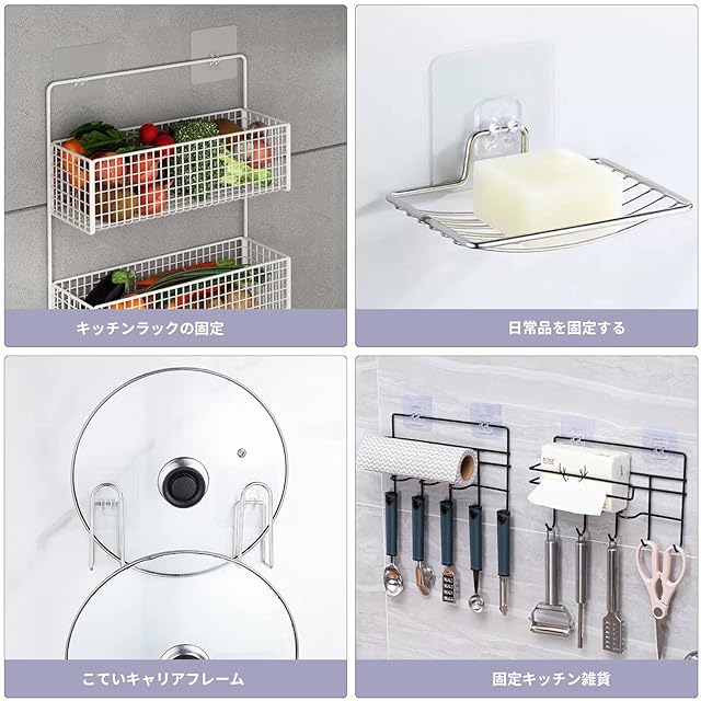 【取り付け簡単】ドリル穴や壁の破損がない。壁を清潔に保ち、フック裏面シールをはがし、フックを壁に貼り付けてしっかりと押さえ、12時間以上乾燥させたまま、物を置く。取り外しやすく、壁に跡が残らない。