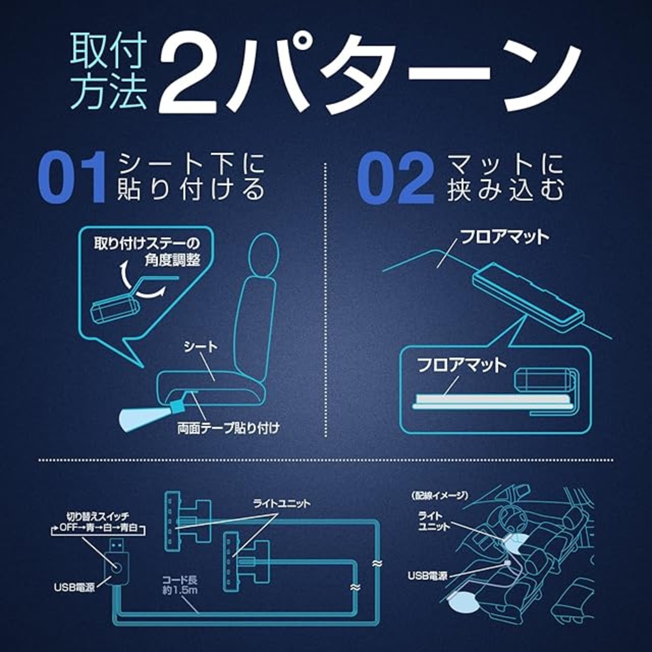 ライトユニットは取り付けステーを使用して、両面テープでシート下に貼り付けたり、フロアマットに取り付けてフロア(足元)を照らします。
