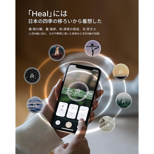 【水、音、光、香り。空間だけじゃなく心もうるおす】Healには空気だけでなく、心も潤すことを目的に、水・音・光・香りの4つの特別な機能を搭載。"水" :最大220ml/hの加湿機能。約7畳(プレハブ住宅)の広さに対応できる加湿量で、寝室や書斎などあなたのパーソナルな空間にぴったり。"音" :日本の四季の移ろいから着想した4曲に加え、ヨガや瞑想に適した音楽など合計8曲が収録。"光":ガラスタンクの下には夜間や暗くしたお部屋を彩るLEDライトを搭載。ライトは専用アプリで好きな色、好きな明るさに設定して頂けます。"香り":ミストの噴出口に備えたアロマユニットにお好みのアロマオイル(精油)を数滴垂らせば、加湿と同時にお部屋に香りの演出も可能です。【花粉対策×電解水除菌加湿器】電解水除菌加湿器は、水を電気分解することで、水中の細菌やウイルス、カビなどの有害物質を除去します。空気中の花粉やPM2.5などの微小粒子も除去することができます。これにより、花粉症の症状を軽減するだけでなく、空気中の清潔さも保つことができます。