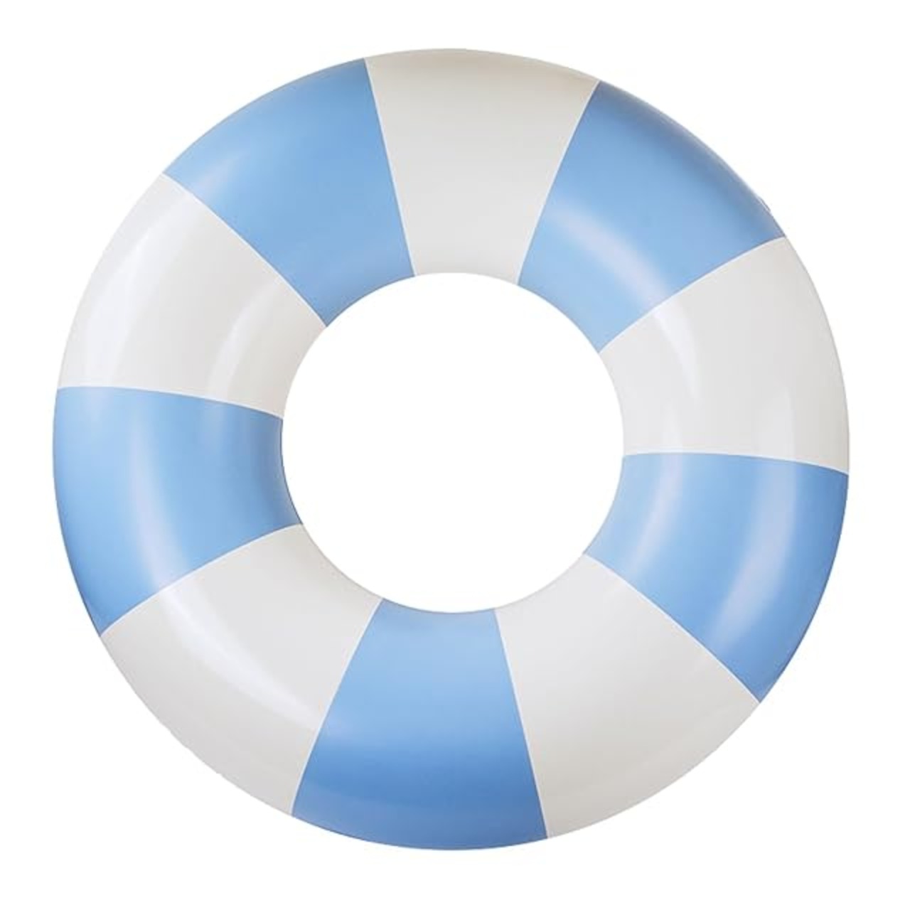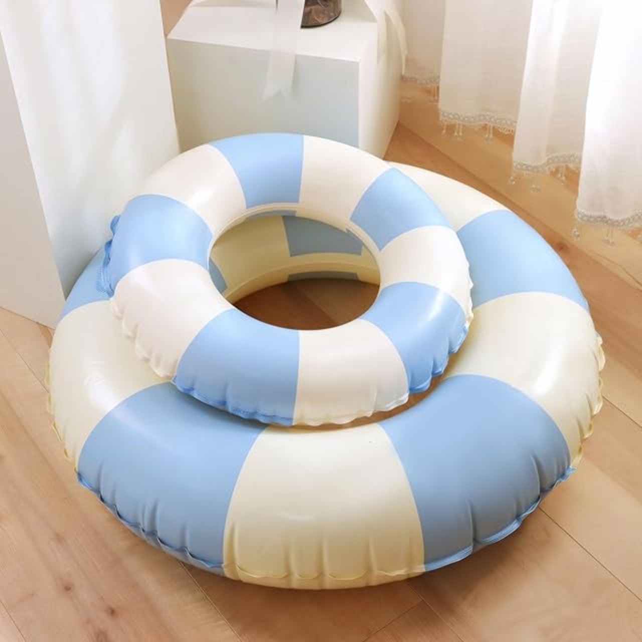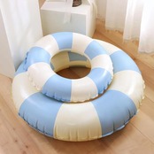 【O型の浮輪】可愛いO型リングの浮き輪です。O型タイプで、穴の部分に身体を入れたり、上から乗ったりして使用します。ブルーとホワイトのストライプ柄はとっても目立ち、夏の日に海やプールで水泳するのにぴったりして、青空の下でプカプカと気持ちよく泳ぎましょう。