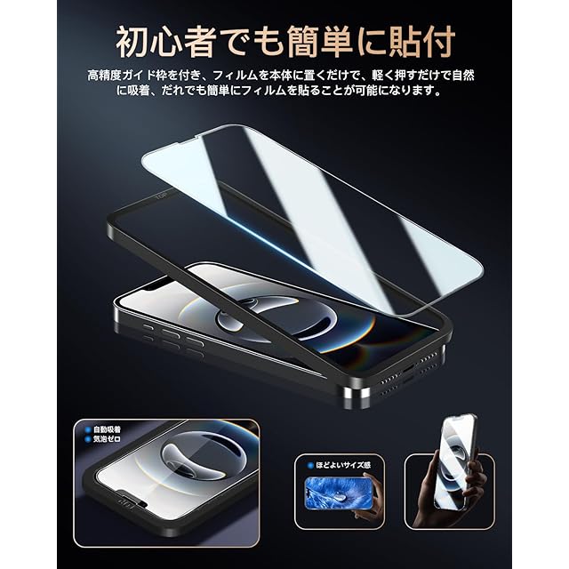 【専用のガイド枠】専用のガイド枠付きで、正確な位置に完璧に貼り付けることができます、保護フィルムの接着面は特殊な自動吸着層を使用しているので、ガラスを液晶に置くだけで自然に吸着し、気泡が出来にくいので、 誰でも簡単、綺麗に貼ることができます。