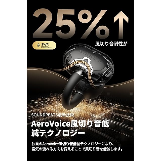 【SOUNDPEATS最新技術、AeroVoice風切り音低減テクノロジー】弊社独自開発で特許出願中の「SOUNDPEATS AeroVoice」風切り音低減テクノロジーにより、空気が流れる方向を変えることで、一般的なイヤホンに比べて風切り音低減性能を25%※向上させます。(弊社ラボにおける測定結果)。防水保護等級はIPX5、飛び散る汗や雨も気にならない、スポーツの理想的なパートナーです。