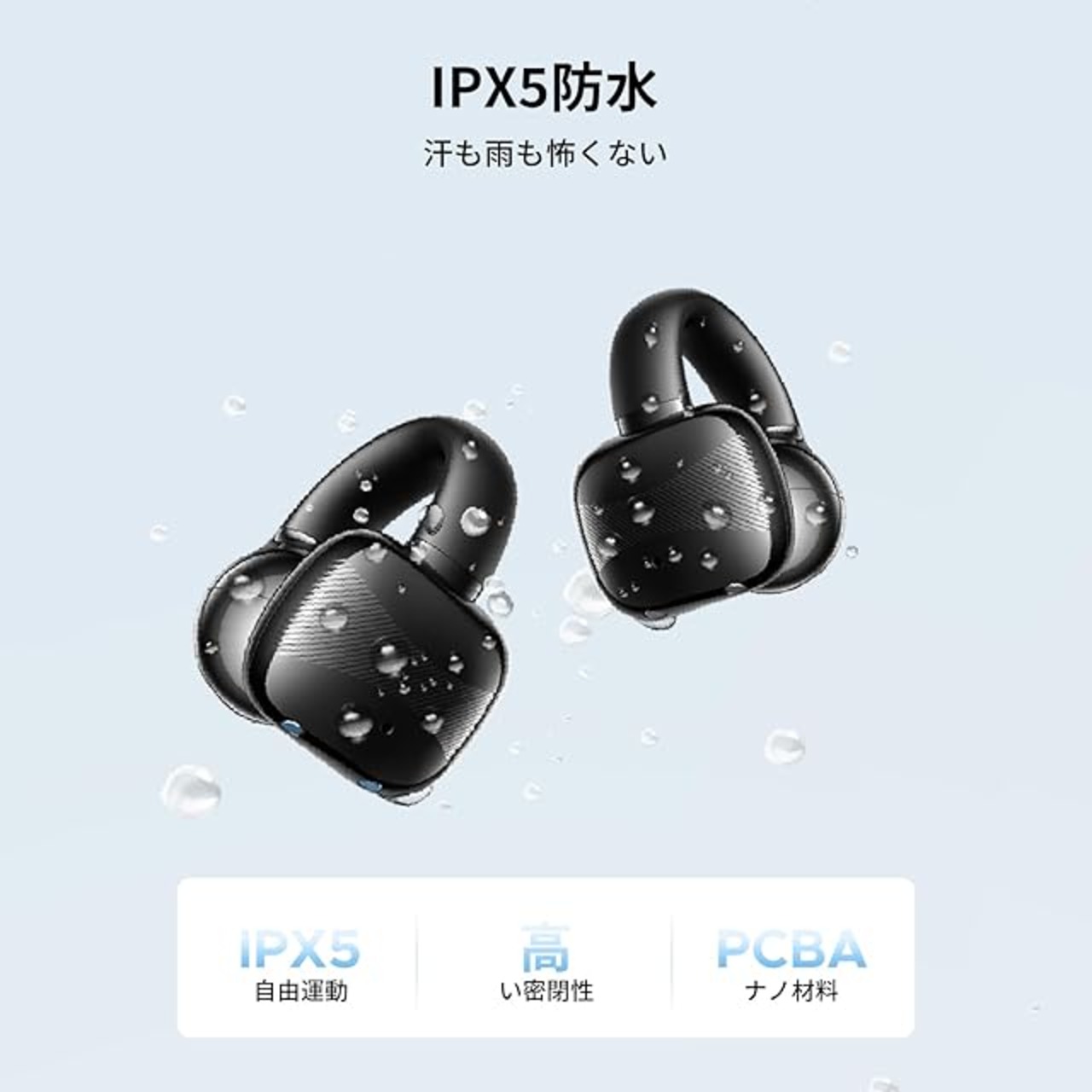 【わずか5.3グラム・耳をふさがない】カナル型の圧迫感も、骨伝導の振動もなし。空気伝導方式で、わずか5.3gという超軽量設計。長時間装着しても疲れにくく、運動中も快適です。IPX5防水対応で、汗や小雨でも安心。ジョギング・ランニング・ヨガ・フィットネス・サイクリングにも最適です。
