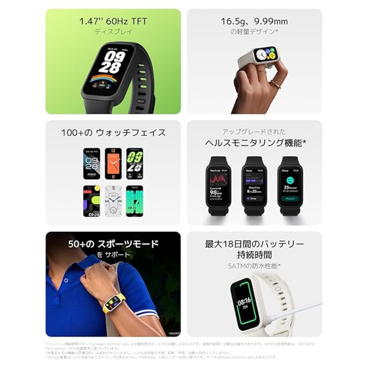 【1.47インチの液晶ディスプレイと9.99mmの薄型軽量設計】1.47インチの大型液晶ディスプレイを採用。表示領域が大きいため、より多くの機能、情報、コンテンツを見やすく表示できます。また、軽量でスリムな9.99mmボディであるため、仕事や運動、睡眠のあらゆるシーンで付けていることを感じさせず、快適な装着感を提供します。
