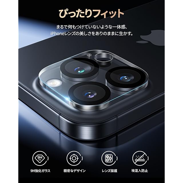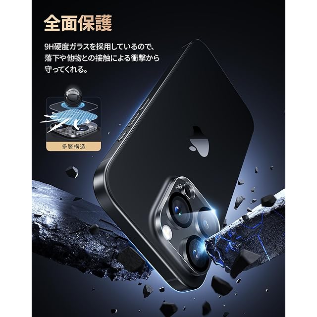 「9H硬度·傷付きにくい」9H硬度ガラスを採用し、ハードコーティング技術により外部からの衝撃をフィルムが吸収し、衝撃を緩和し画面の破損を最小限に抑えます。日常生活の中で、バッグやポケットの中で付いてしまう引っかき傷に対しても高い耐久性を持っているので、いPhone16Pro/いPhone16ProMaxのカメラをしっかりと守ります。また、特殊な飛散防止加工により、万が一割れてもガラス破片が飛び散ることなく安心です。