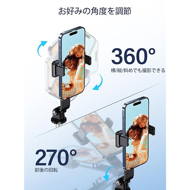 【360°+260°全方位自由調節】自 撮り 棒のクランプは従来型にある水平360°回転を受け継いだ以外、より一層改良できたところは上下260°回転実現、撮影角度を気にする必要はありません。横幅4~7インチのスマホをじどり棒のホルダーに装着するのが可能、小さい端末でも、大画面の端末でもしっかり固定できます!