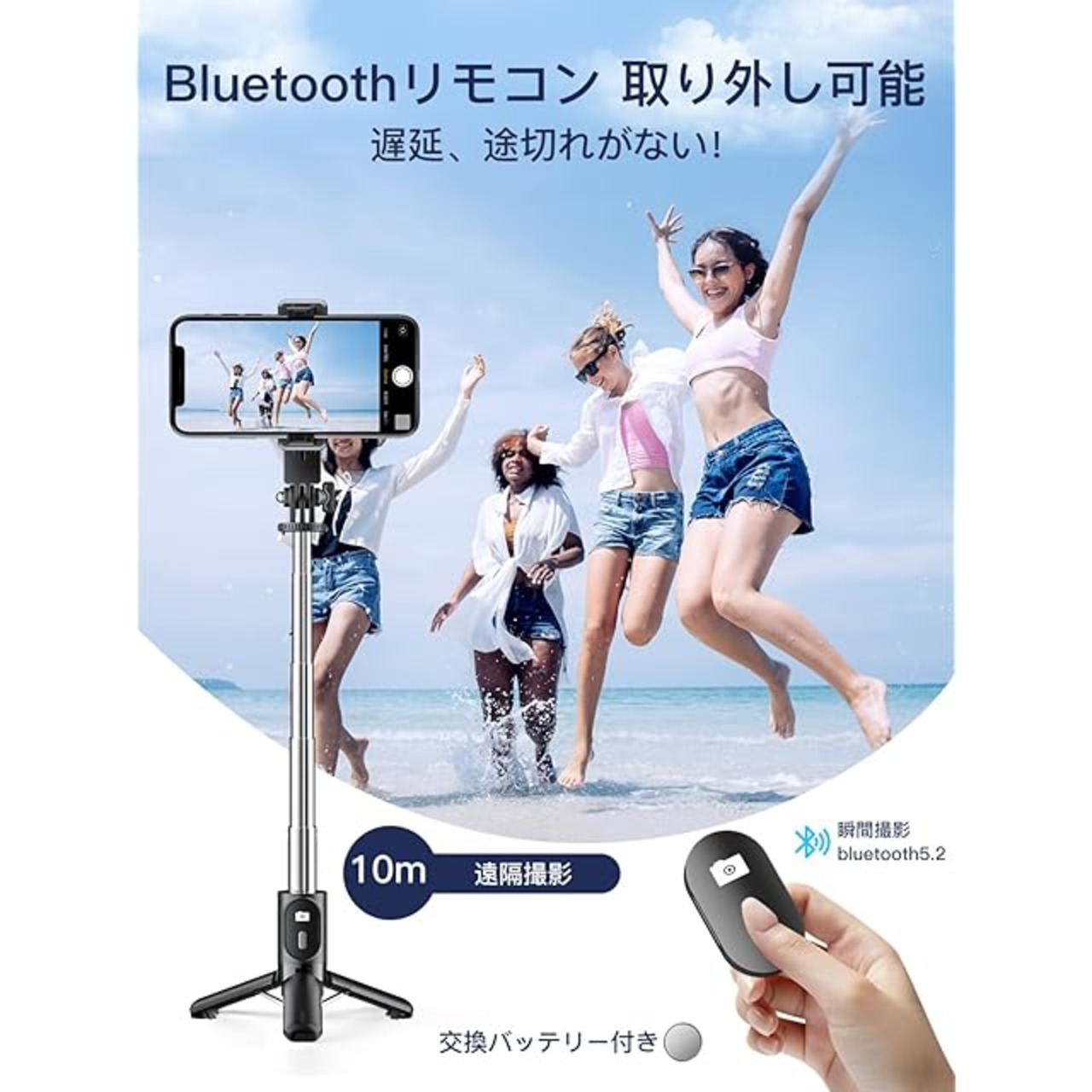 【0遅延で写真を撮れる】自撮り棒の無線リモコンは最先端ブルートゥース5.2技術を採用、通信範囲や伝送速度が大幅にアップするため、境に左右されない優れた接続安定性を実現していて、ワンタップですぐに撮れる、遅延、途切れがありません。10m遠隔撮影が対応、家族写真、一人旅など素晴らしい全身写真が実現できます。初心者にも簡単操作できる、初期接続が完了すると、セルカ棒のリモコンは電源をオフにしても設定が残ります。再度電源オンにして、自動で最後に接続されていたスマホへ瞬時接続を実現しました。*ブルートゥース機能が搭載されるAndroidとiOSのスマホに対応可能です。