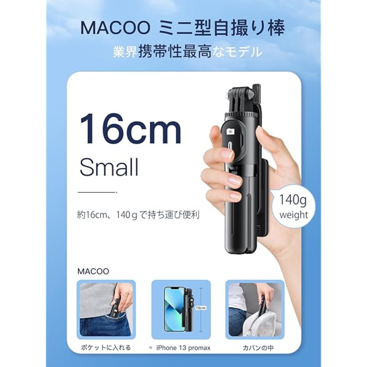 【軽量、ポケットサイズ】MACOOは自撮り棒を使用するシーンを考えて、数え切れないほどの実験の経て、自撮り棒の機能が満たされている状態で更に小型に進化しました。自撮り棒は71cmまで伸縮可能、折り畳んだ状態は16㎝、500mlのペットボトルよりも小さい、薄さは半分ぐらい、ズボンのケットにも入ります。じどり棒の重量は約140g、市販商品と比べると35%軽量化して、持ち運びは非常に便利です!