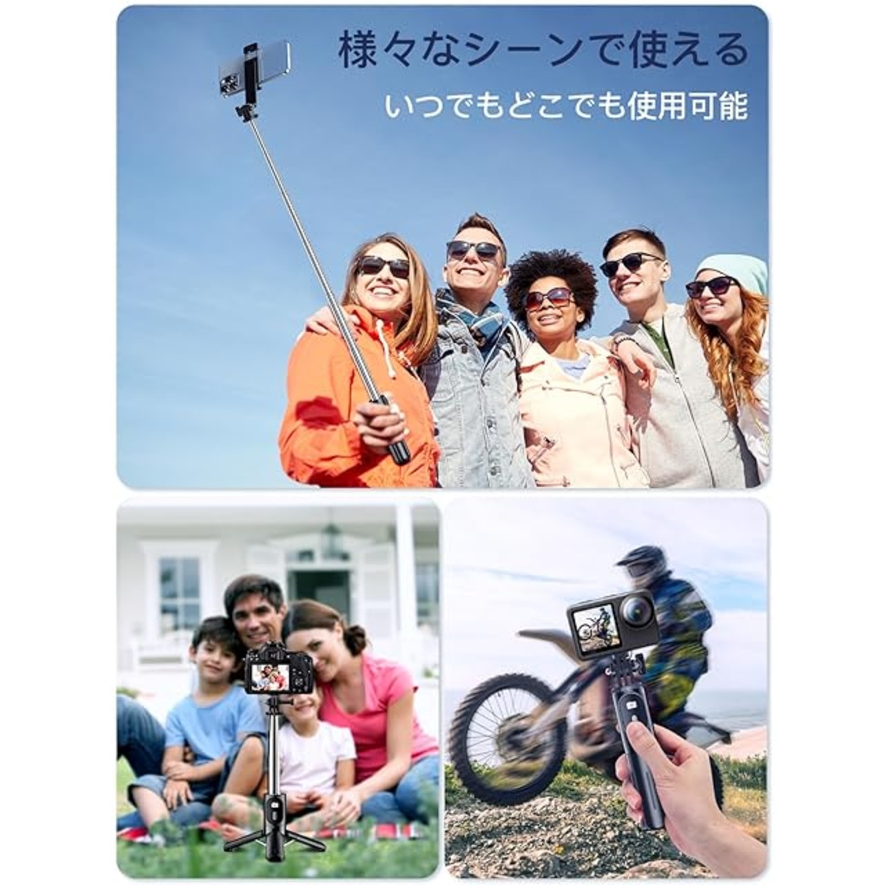 【4-in-1自撮り棒】自撮り棒は三脚を内蔵したタイプで、手持ちのセルフィーだけでなく、三脚 スマホスタンドとして動画鑑賞、集合写真、生放送、オンライン会議などにも適用です。用途の広いデザインにより、1/4ネジを付き、デジカメ用スタンド、アクションカメラ じどり棒、または生放送用リングライト 三脚としても使用できます。無期限のカスタマーサポートで、万が一製品に関する問題ありましたら、弊店にご連絡頂ければ弊社より早速に解策をご案内します!