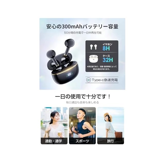【最大32Hの長時間再生&Type-C急速充電】イヤホン単体は1回のフル充電で最大8時間、充電ケースを併用すると最大48時間の音楽再生が可能です。頻繁に充電する手間が省けるから通勤通学はもちろん、出張や電話会議にも安心して電池切れの心配はありません。急速充電対応のType-Cポートを搭載しているので、充電もさらに便利で充電もさらに!充電ケースは約1時間程度で満充電可能です。