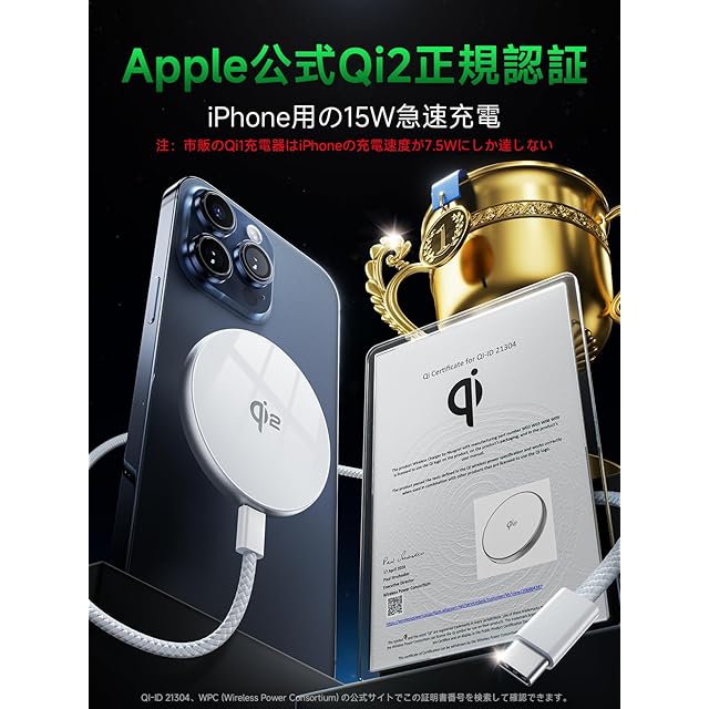 商品名:ワイヤレス充電器 【Qi2 公式認証·15W放熱強化】 MagSafe充電器 マグネット式 超薄 超軽量 小型 マグセーフ充電器 1∶1適合 强磁気 置くだけ充電 iPhone 17/16/15/14/13/12 pro max plus airシリーズ対応 出張·旅行·オフィスに最適 + 40W type-c 高耐久編み込み式ケーブル 1m付き