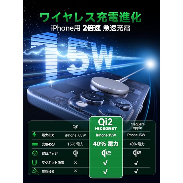 【A-pple公式Qi2認証 15W 急速充電器】Qi2はA-ppleとワイヤレス充電連盟(WPC)が制定した最新のワイヤレス充電器規格で、iPhoneのワイヤレス充電速度を7.5Wから15Wに倍増させます。qi2 充電器はわずか45分でiPhone 15を40%まで充電できるのに対し、Qi1充電器は15%までしか充電できません。これにより、貴重な時間を大幅に節約できます。NICEGRETは、最初のQi2公式認証を取得した企業の一つです(QI-ID:21304)。数ヶ月にわたる精密な開発と455,734人以上のユーザーからのフィードバックを経て、急速充電、強力な磁気吸着、安全性、美しさ、便利さを兼ね備えた「magsafe充電器」を誇りを持ってご紹介します。これにより、あなたのワイヤレス充電体験が新しい次元に引き上げられます!