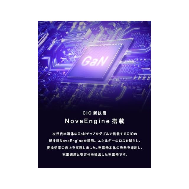 【新技術 NovaEngine搭載】次世代半導体のGaNチップをダブルで搭載するCIOの新技術NovaEngineを採用。エネルギーのロスを減らし、変換効率の向上を実現しました。充電器本体の発熱を抑制し、充電速度と安定性を追求した充電器です。