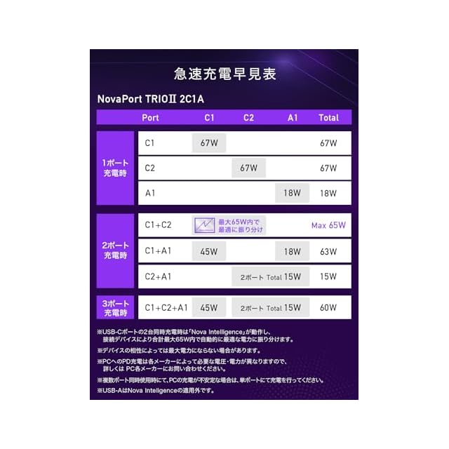 【3ポート搭載】複数デバイスご利用のユーザーに便利な3ポート(Cポート2,Aポート1)搭載 。USB-C1+USB-C2+USB-Aの合計出力は最大60Wの高出力。 USB-C1+USB-C2の合計出力は最大65Wの高出力。 USB-C1+USB-Aの合計出力は最大63Wの高出力。USB-C単ポート最大出力67Wでノートパソコンへの充電にも対応! スマートフォン(iPhoneやAndroid)からタブレット(iPad)、ノートPC(Macbook、Windows PC等)まで幅広い機器に対応しており、これ一つでご自宅でも外出先でも快適にご利用いただけます。 ※USB-C2+USB-Aの合計出力は最大15Wとなりますので、USB-C1をご利用ください。 ※詳しくは急速充電早見表(画像)をご確認ください。