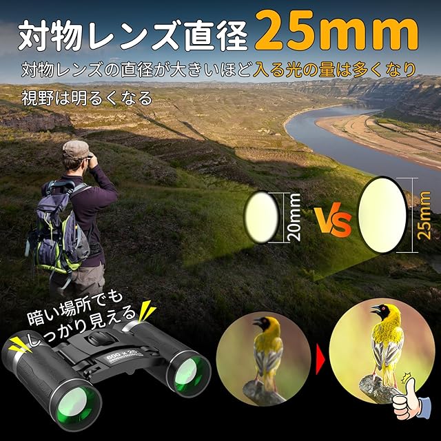 【20*25鮮明に見やすさ】双眼鏡 ライブ用は20倍のズームを備えており、コンサートやスポーツ観戦、野鳥観察などに最適です。お気に入りのアーティストや選手、鳥の全身を視界に捉え、楽しさが倍増します!