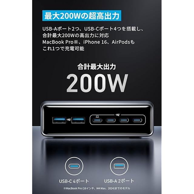 最大200Wの超高出力:USB-Aポート2つ、USB-Cポート4つを搭載し、合計最大200Wの高出力に対応。MacBook Pro、iPhone 16、AirPodsもこれ1つで充電ができます。
