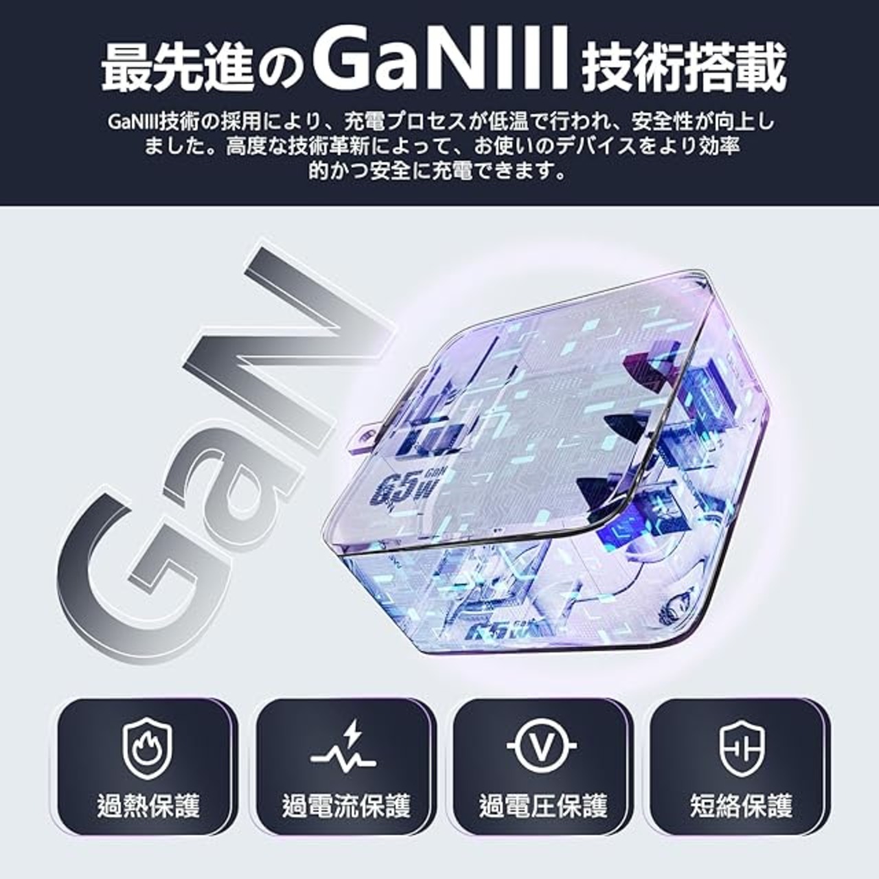 【スマートな充電保護、各設備を安心して守護】PD65W充電器は、先進のGaNIII(窒化ガリウム)材料と「3Dチップスタッキング技術」を駆使しています。この特殊な組み合わせにより、充電器はコンパクトながらも非常に効率的な電力変換が可能で、内部の熱を最小限に抑えながらも高いエネルギー効率を提供します。更に、進化した「3Dチップスタッキング技術」により、わずかなスペースに多くの機能を組み込み、PD65W充電器は過電流、過電圧、過熱などの問題から包括的にデバイスを保護し、高い充電効率と信頼性を実現しています