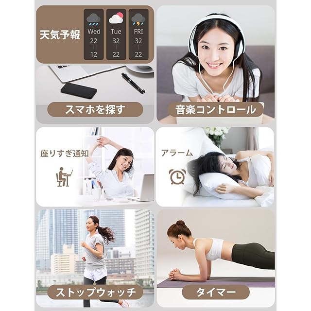 「100+文字盤·座りすぎ通知·生理周期」スマートウォッチ本体に5つの文字盤を搭載。専用アプリで100以上の文字盤をダウンロードできるだけでなく、アルバムや撮影により、お気に入りの写真を文字盤に設定することもでき、毎日気分に合わせたスタイルを楽しめます!専用アプリで座り過ぎのリマインダーの時間帯や間隔を自由に設定し、日常生活に無理なく取り入れられます。体を動かすタイミングを見逃しません。さらに、女性の生理周期を記録する機能では、アプリで生理周期の開始日と終了日を記録することで、次回の予想月経日や排卵日などを予測することができます。