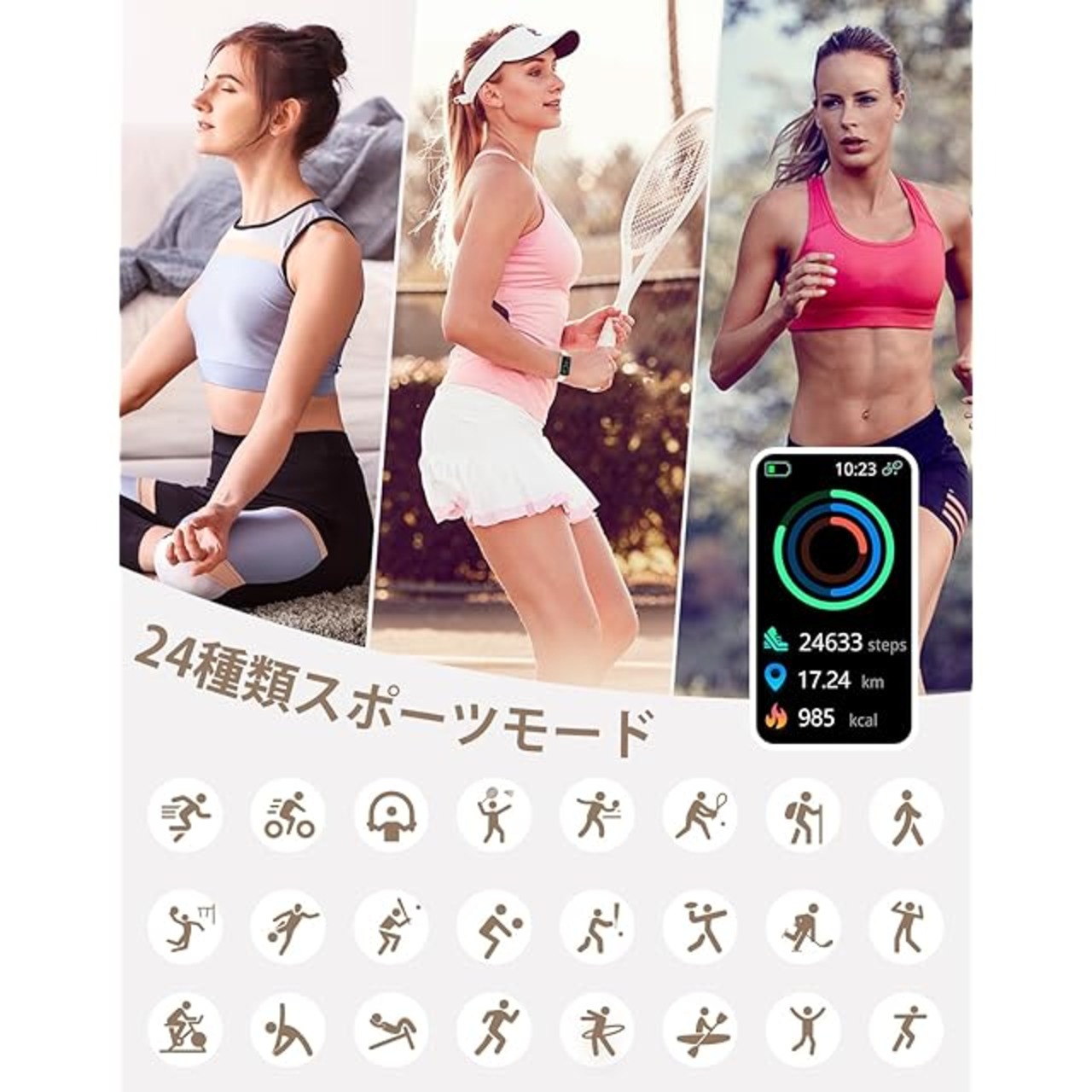 「24種類の運動モード·IP68防水」スマートウォッチL2には24種類の運動モードがあります。ランニング、ウォーキング、登山、ヨガなど、あらゆる種類の運動に対応しています。運動中にこのウォッチを身につけて、自分自身のフィットネスレベルを向上させましょう!さらに、このウォッチはIP68の防水機能を備えており、普段は手や顔を洗うときに外す必要はありません。しかし、海水、プール、お風呂、サウナ、温泉などの熱い水中では使用できません。これらの環境下で使用すると、ウォッチが損傷する可能性があります。使用する際には、この点にご注意ください。
