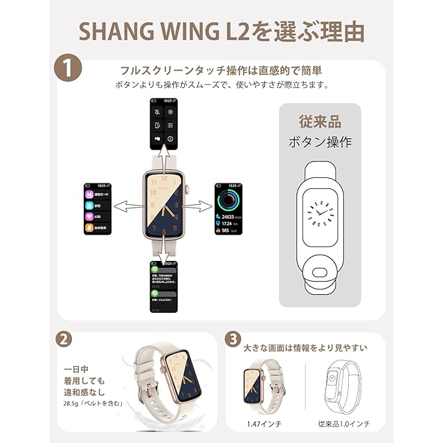 「1.47インチ·超軽量·使いやすい」スマートウォッチL2は、1.47インチの長方形のスクリーンを搭載し、解像度は170×320で、文字がクリアで読みやすくなっています。男女兼用で、バンドを含めた重量はわずか28.5gで、一日中付けていても違和感を感じません。タッチスクリーン操作で、アプリ「GloryFit」に接続すれば、簡単に使うことができます。また、このスマートウォッチは、多様なシーンで活躍できます。スポーツ時には運動データを記録し、日常生活管理に役立ちます。ビジネス時には、通知を受け取ったり、スケジュールを管理したりすることができます。さらに、レジャー時には、音楽コントロールや写真撮影のリモート操作が可能です。このように、様々な場面で活用できるスマートウォッチです。