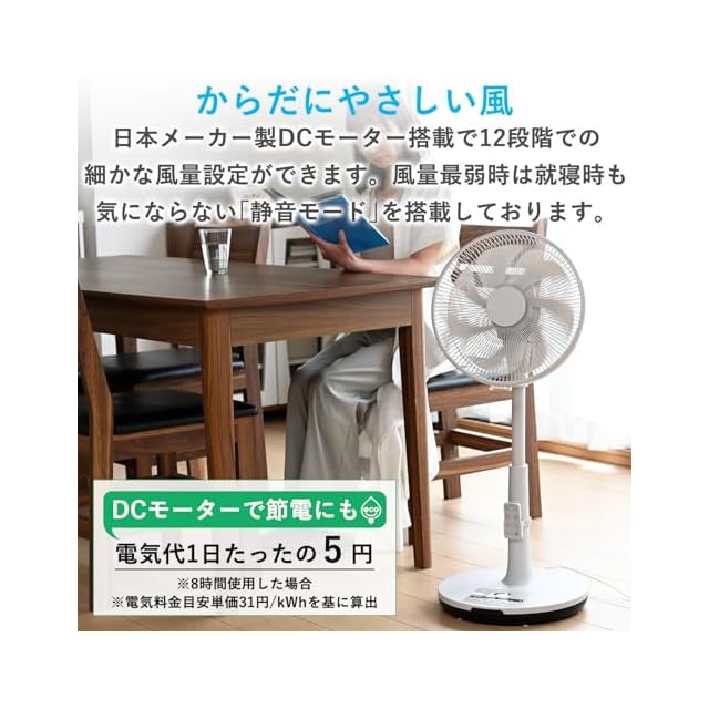 【DCモーター搭載】ここちよい風を送ってくれるDCモーター搭載のリビング扇風機。DCモーターで羽を回すことで、ACモーターよりも羽根の回転を幅広く設定できるので、小さな風を効率よく起こすことが可能です。消費電力も少なくて済み、節電にもつながります。
