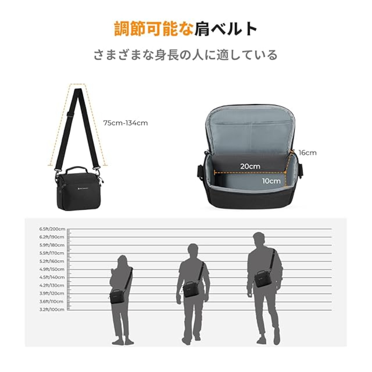 【調節可能なカメラバッグ ショルダー】取り外し可能と長さ調節可能なショルダーストラップは、さまざまな体型に適応でき、長時間のハイキングでも揺れないようにすることができ、カメラショルダーバッグとしてだけでなく、持ち運び用のレジャーバッグとしても使用できます。