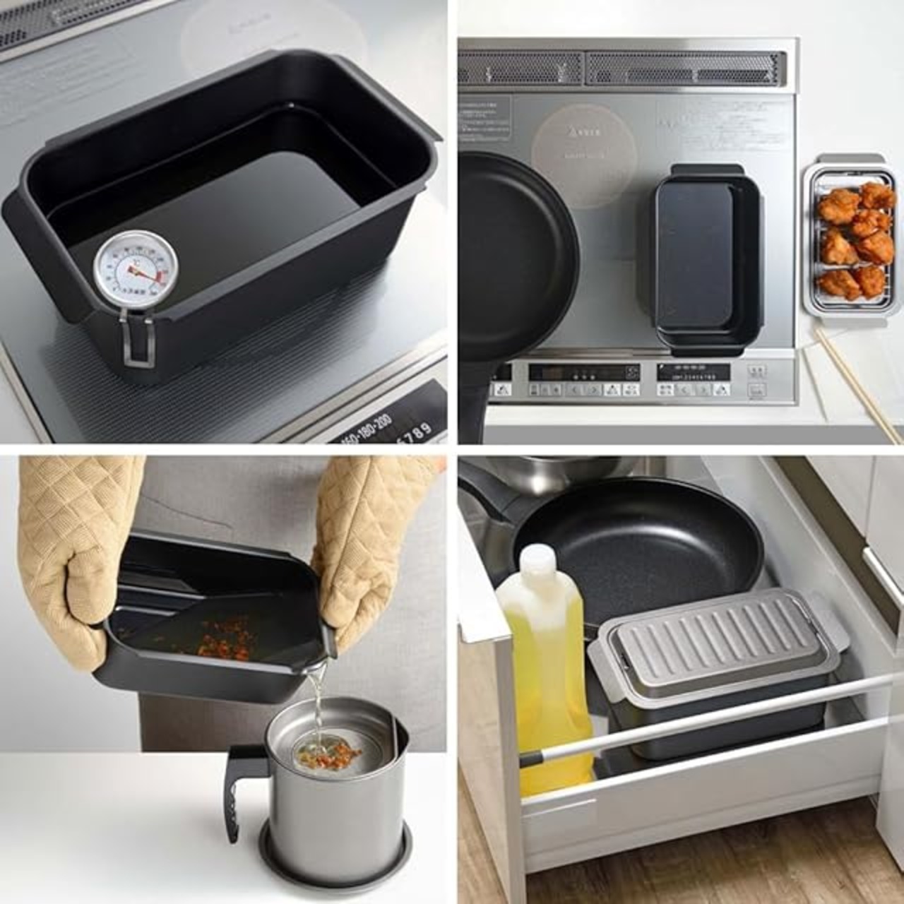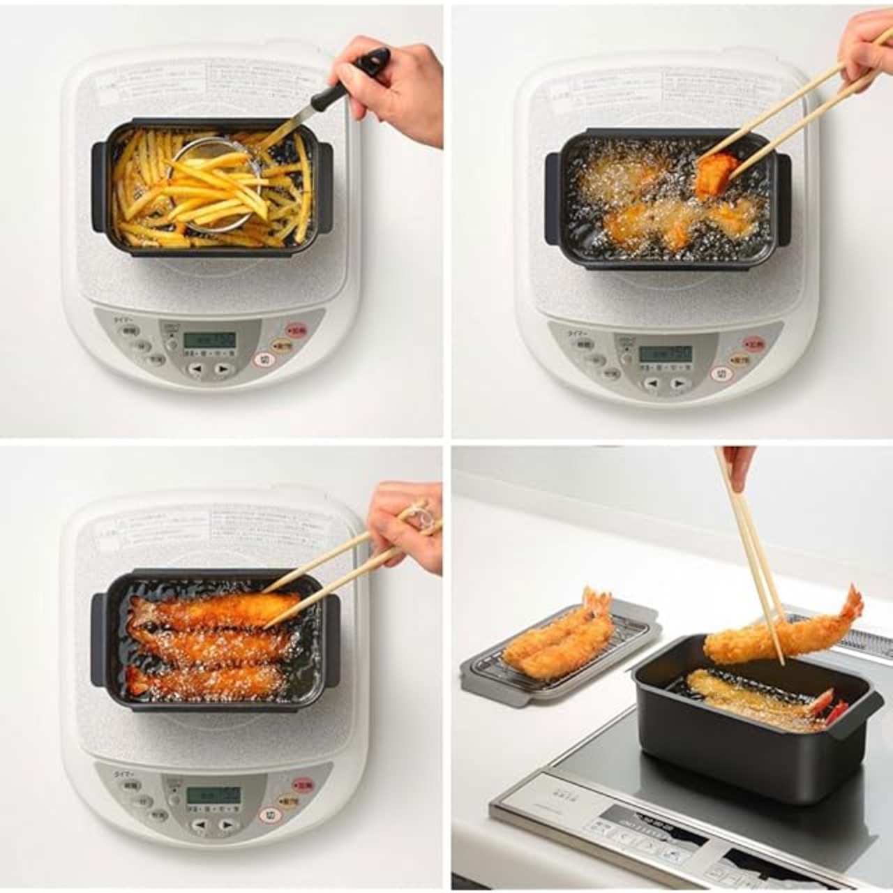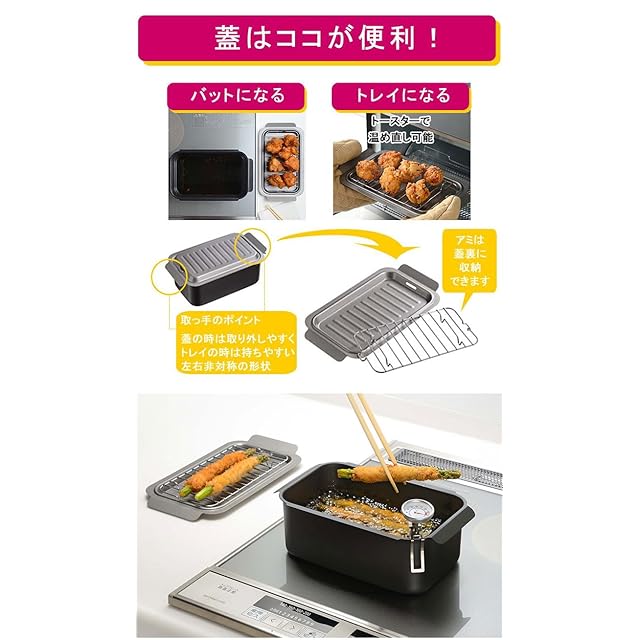★使い方は「本体のみ・アミ付・温度計付」の3通り。1.シンプルに揚げ物だけ→本体のみ 2.油切りも欲しい!→アミ付 3.揚げ物を最適温度で揚げたい→温度計付き