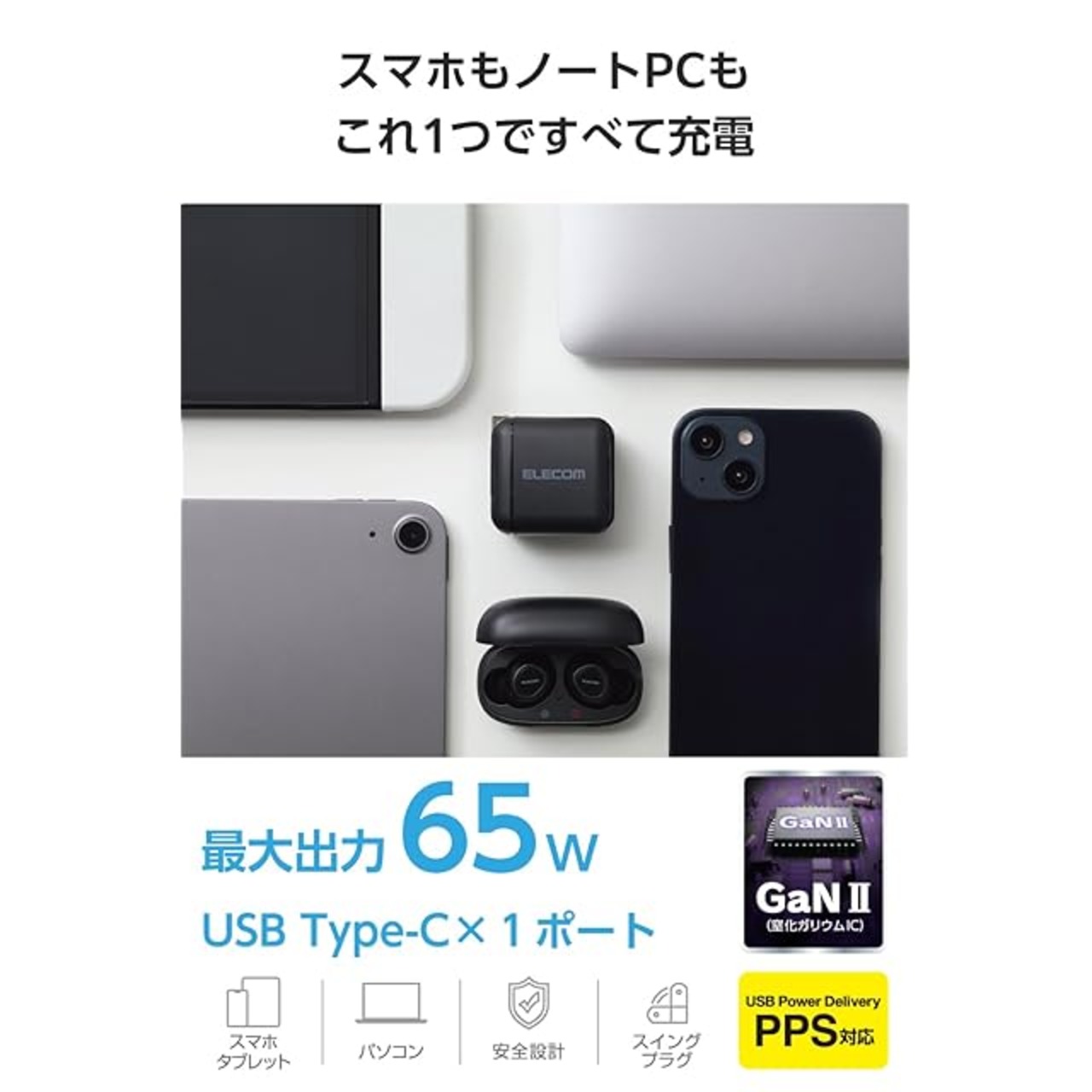 商品名:エレコム 充電器 65W USB PD対応 小型 Type-C 1ポート PPS対応 GaN II採用 PSE認証 ブラック 【iPhone 16 15 iPad Macbook 等対応】 EC-AC8565BK