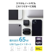 ノートパソコンからスマートフォンまでこれ1台で充電できる、高出力のUSB AC充電器です。デバイスごとに専用の充電器を持ち運ぶ必要はありません。※USB Power Delivery規格で65Wまで充電できる機器に限ります。