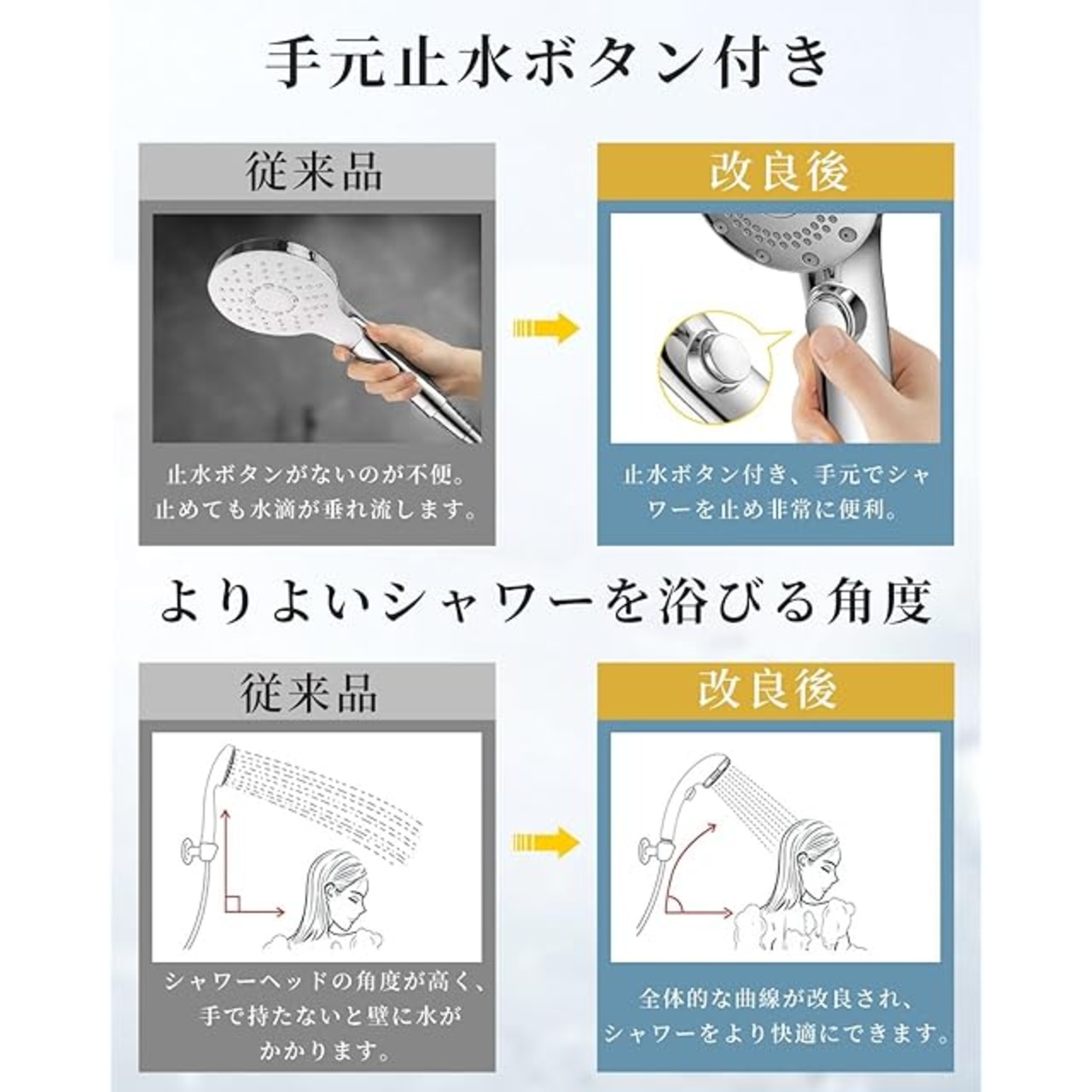 【5段階水流モード&手元ストップ機能】5つの出水モード:レインモード、レイン+マッサージモード、マッサージモード、ミストモード、ミスト+レインモード。頭皮の汚れを洗い落としたいときにレインモード。低刺激で気持ちのよい肌あたりで顔やデリケートな部位をやさしく洗いたいときにミストモード。肩や腰の疲労を解消したいときにマッサージモード。体部位に合わせて水流モードを使い分けることで、より効果的で快適なシャワーの時間を楽しめます。また、止水ボタンを押すだけでワンキーストップが実現し、オン・オフを切り替えやすいのでとても便利!手元一押止水と水量調整機能の両方で、蛇口の開閉が必要なくワンタッチで水を止められるため、長期的な水道代の削減に効果的です。▲一時止水ですので、スイッチでの長時間の止水はおやめください。シャワー使用後はスイッチではなく、必ず水栓を閉めて水を止めてください。