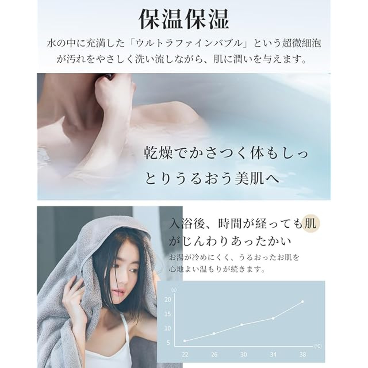 【最新モデル・数億級までのナノバブル&洗浄力抜群】マイクロナノバブルシャワーヘッドの効果とは「洗浄力」のこと。数億級まで達する超微細気泡が発生できるこのシャワーヘッドは、毛穴の奥の汚れを効果的に取り除け、肌を清潔に保つ効果が期待できるため、肌のケアに適しています。特にミストモードでは霧のように細かく、顔を洗っても刺激なく、お年寄りや子ども、女性にもおすすめ。また、水圧調整も肌への刺激性も向上し、洗浴中に水分が肌から奪われず、肌が乾燥しづらくなります。お湯の温度を長く保ち、より長い入浴時間を楽しめるとともに、一日の疲労感を解消して体をリラックスできます!