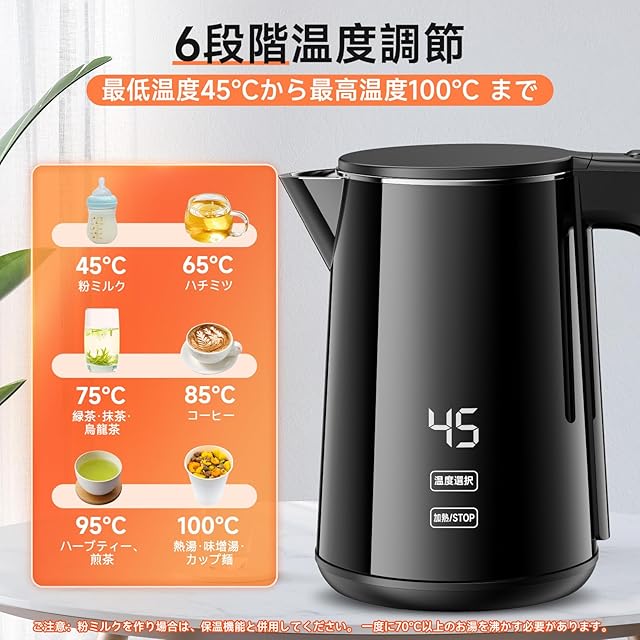 ☀7段階温度調節&4時間保温☀:飲み物に合わせた美味しい温度で楽しむことができる7段階の温度調節機能付き、赤ちゃん用ミルク/お茶/コーヒー/カープラーメン/お湯などの様々なシーンで大活躍!密閉度の高い構造をしているため、お湯が沸いたあともあたた。 さらに、4時間保温機能付き、簡単に適当の温度を設定します。リモートワークや夜間粉ミルクを作る時にも役立ちます。ご注意:粉ミルクを作り場合は、保温機能と併用してください。 一度に70℃以上のお湯を沸かす必要があります。また、保温機能とは、設定温度より下がるとすぐに温めなおしてくれる。
