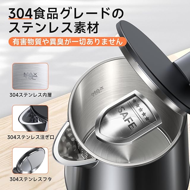 健康で安心!二重構造ケトル:本電気ケトル内層は食品グレードの304ステンレススチール製で、防錆性と耐食性があり、匂い移りが少なく無臭無味の熱湯が用意できて、水との健康的な接触を保ちます。外層は食品用PP素材、金属と比較すると表面に温度が伝わりにくく、やけどのリスクを低減可能。(安全水位ライン:MIN0.5L、MAX1.0L)