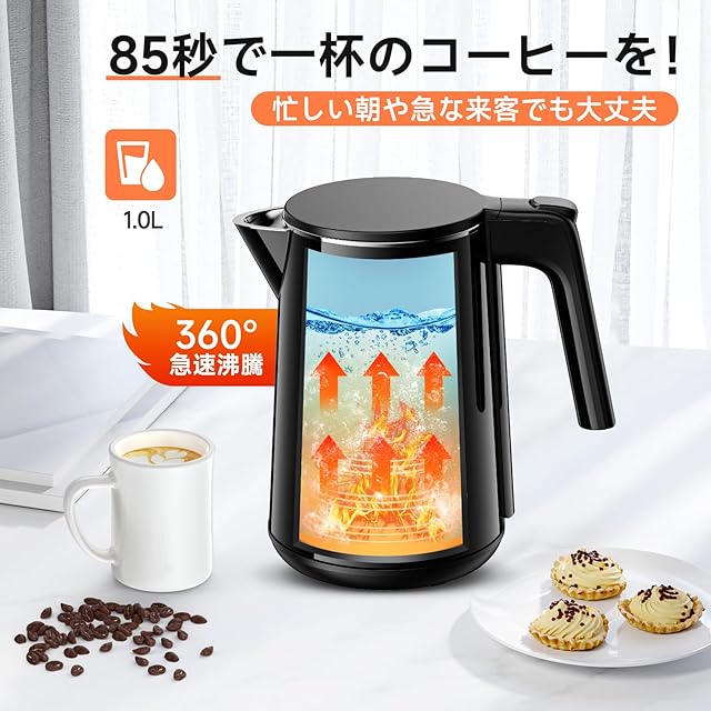 急速沸騰、安全性も抜群:忙しい朝に!すぐ飲みたいときに満水時(1.0L)が約5分で沸騰する。ガスや火を使わずにお湯を沸かせるうえ、空焚き防止機能も付いているので、安全性も抜群。ワンタッチボタンで蓋が開き、熱気でやけどする心配はありません。2段階の開口角度調整ができる蓋で、手を簡単に入れて掃除することができます。沸騰までのスピーディさ・使いやすさ・安全性、すべて妥協できない人におすすめです。