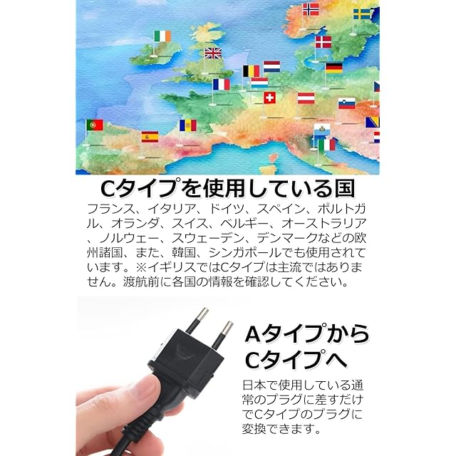 【 Cタイプを使用している国 】 フランス、イタリア、ドイツ、スペイン、ポルトガル、オランダ、スイス、ベルギー、オーストラリア、ノルウェー、スウェーデン、デンマークなどの欧州諸国、また、韓国、シンガポールでも使用されています。※イギリスではCタイプは主流ではありませんのでお調べの上ご購入下さいませ。