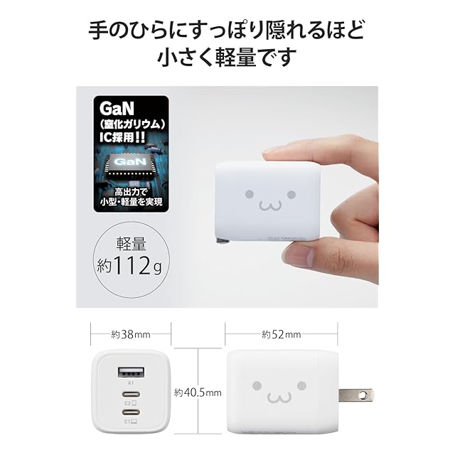 商品名:エレコム 充電器 65W USB PD対応 3ポート Type-C USB-A 【 iPhone 16 15 14 iPad Macbook Air ノートPC】 しろちゃん EC-AC4465WF