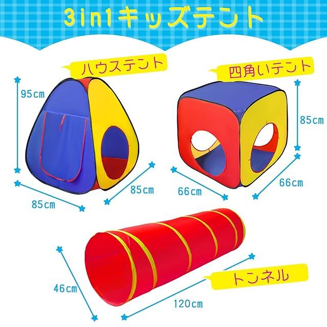 <b>商品仕様とサイズ </b><br> <b>●セット内容:</b>ハウステント*1、トンネル*1、ボールプール*1、収納バッグ*1、取扱説明書*1。<br> <b>●展開サイズ(約):</b>280*120*95cm<br> <b>●包装サイズ:</b>42*34*5cm<br> <b>●重さ:</b>●1.8kg<br> <b>●材質:</b>ポリエステル、グラスファイバーポール<br> <b>●年齢:</b>3歳以上の子供<br> <br> <b>その他の詳細</b><br> -タンブラー乾燥はしないでください。<br> -火から離れて。<br> -ポリエステルは耐久性があり、汚れに強く、お手入れも簡単です。<br> -室内で、お庭で、公園で、広げればどこでもお子様の遊園地に。<br> -雨の日などで外で遊べないときに嬉しいアイテムです。<br> -メッシュ生地で通気性も良く、暑くなりにくいです。<br> -畳んでスリムに収納可能です。<br> <br> <b>使用上の注意事項</b><br> ■改造/本来の目的以外/強い衝撃などはお控え下さい。<br> ■ディスプレイ画面等の環境上、写真と実際の商品の色とは多少違う場合がございます。<br> ■保護者の方の目の届くところで遊ばせるようにして下さい。<br> ■商品紹介の写真に飾りやライトやぬいぐるみは含まれていません。<br>
